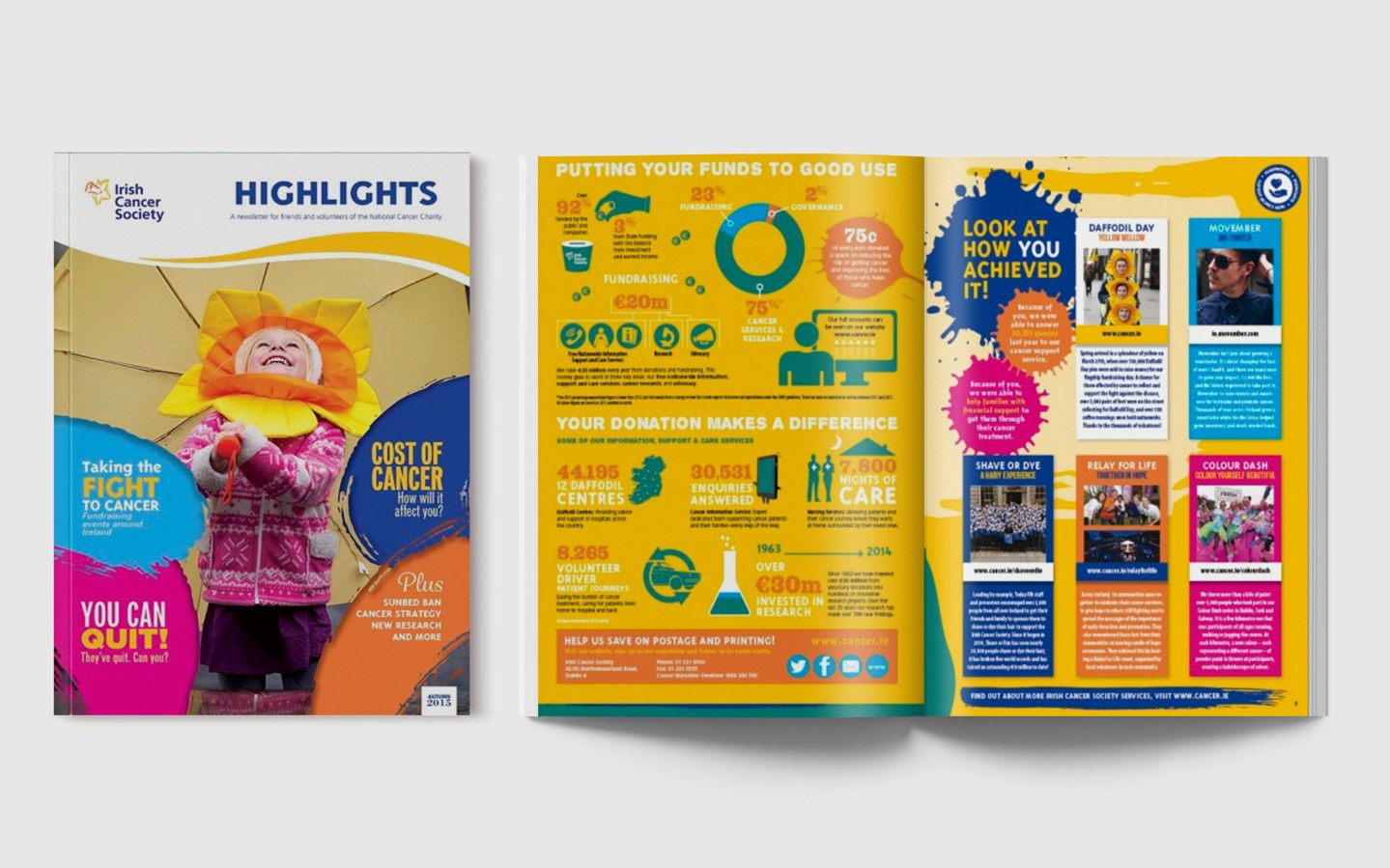 Redesign of newsletter for the Irish Cancer Society, Autumn 2015.