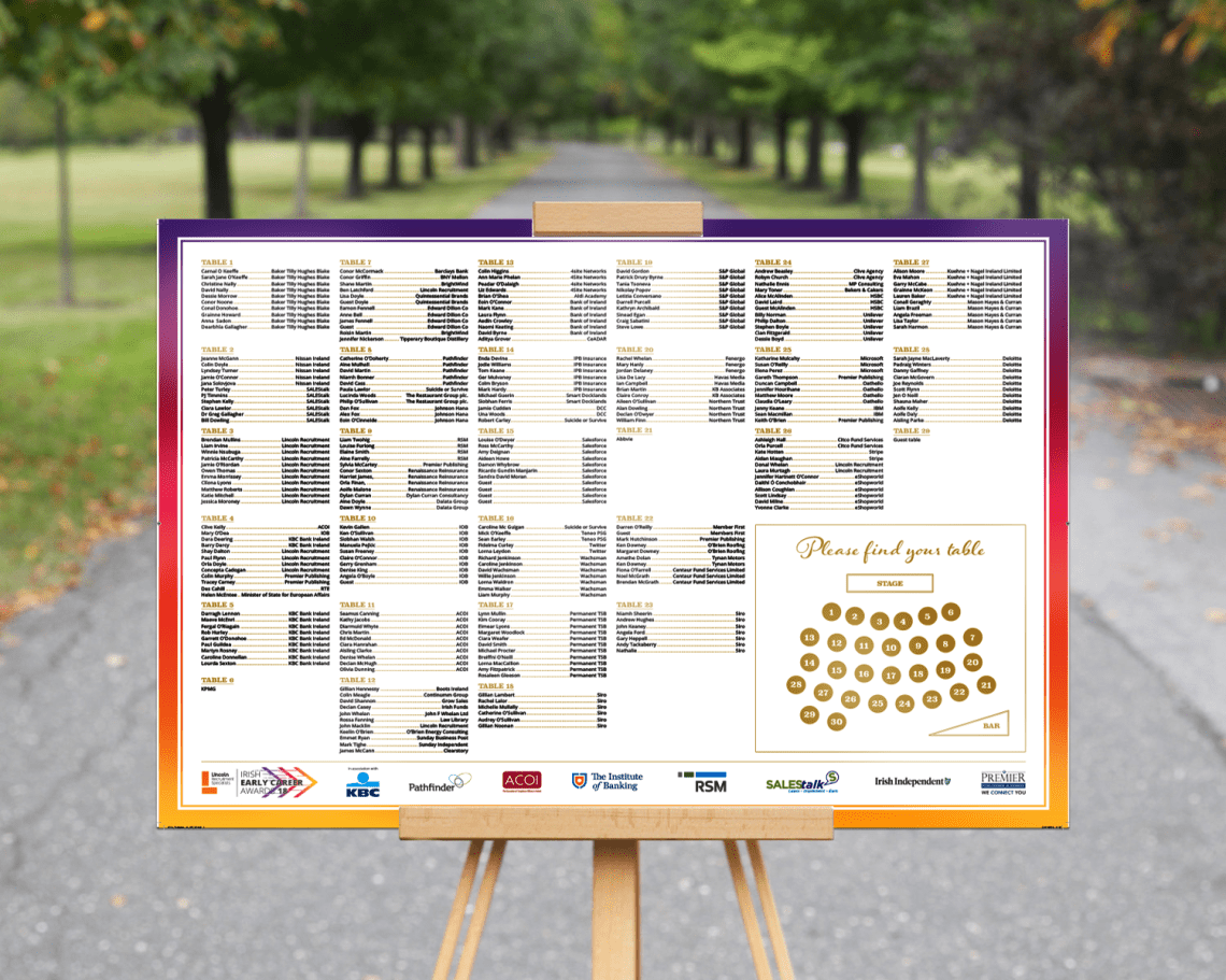 Roll out of pre- and post-event campaign for the Irish Early Career Awards, including press adverts, event brochure, digital graphics for website and social media, venue graphics including stage, tent cards, presentation slide design, menu, seating plan.